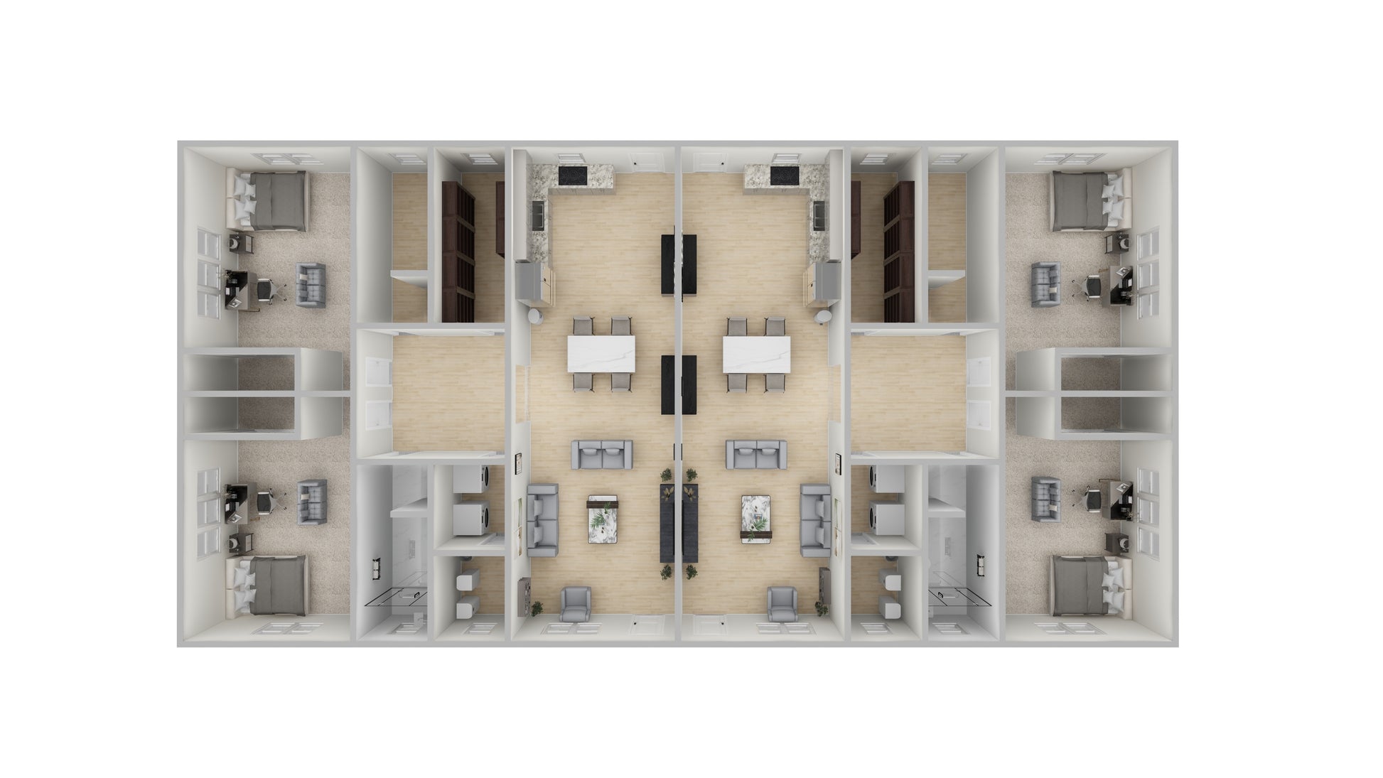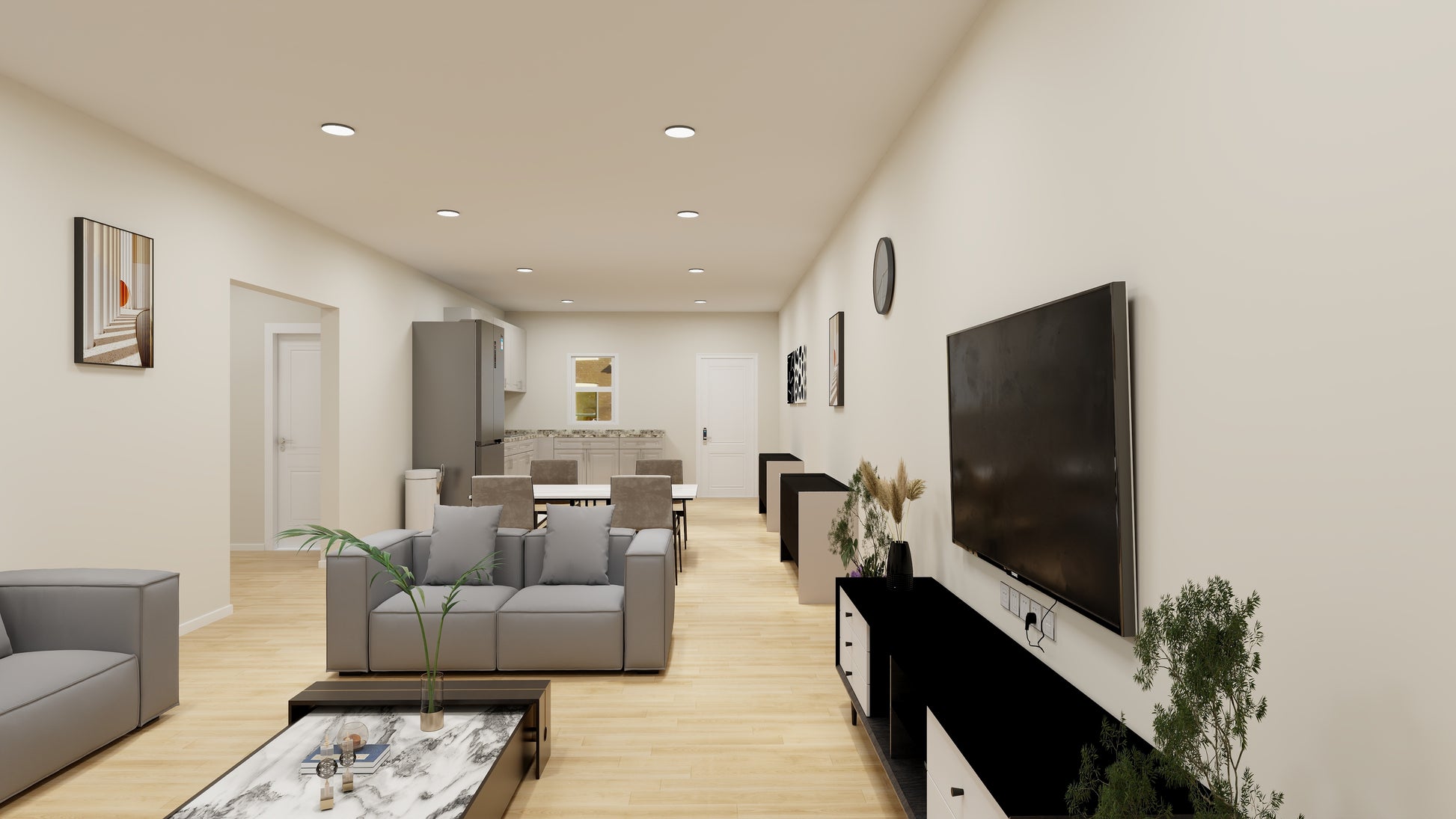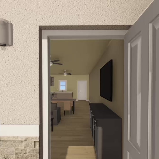This plan set is for 2 Bedroom, 1 Bathroom duplex design using CMU blocks or Light Frame (Wood Stud) construction. Included in this package is an PDF file of a full set of drawings, 3D Floor Plan, Interior & Exterior Rendering, an editable CAD file, a functional 3D Building Model, & and an editable 3D model file.