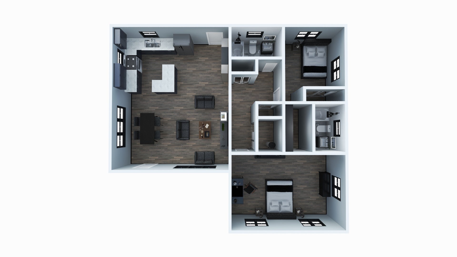This plan set is for 2 Bedroom, 2 Bathroom design using CMU blocks or Light Frame (Wood Stud) construction. Included in this package is an PDF file of a full set of drawings, 3D Floor Plan, Interior & Exterior Rendering, and an editable CAD file.
